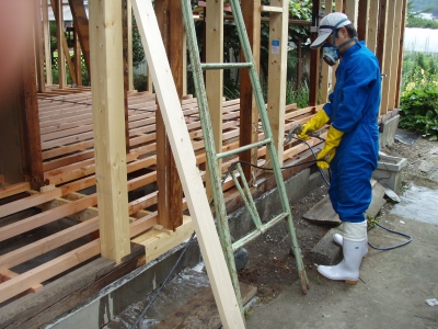 ほぼ全面リフォームを施すお宅でのシロアリ駆除・防除工事を行いました。ここまで構造があらわになっていると、より隅々まで薬剤を散布することが出来ます。このようなリフォーム工事をされる場合は、写真のように根太組が終わった段階で施工をされると効果的です。基礎表面は化粧としてモルタルを塗ってある工法です。