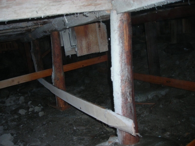 床を支える「束柱」に、通常よりサイズが長く、角材ではなく丸材が使用されています。また、各構造材も、現在使用されている建築材と比べるとサイズも小さかったりと、心もとないものであります。