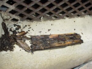 確認のために少し触れてみると、ポロッと落下してしまいました。この部分は腐朽菌による劣化を招いていたようです。木材を痛めるのはシロアリだけではありません。