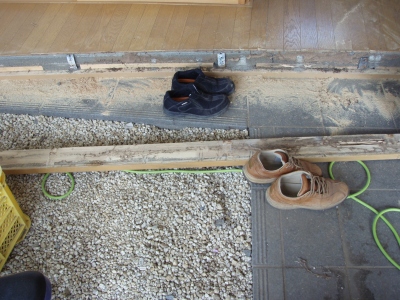 玄関のコンクリート土間の上に直接板張りをしていく工法が取られていて、コンクリートのつなぎ目部分からシロアリが侵入し、直張りの板をそのまま食べ進んでしまいました。