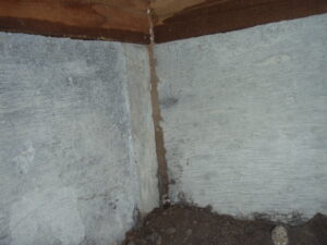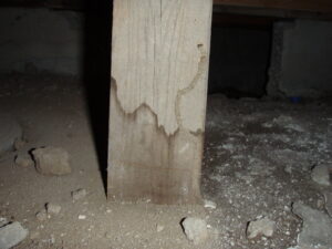 通常は束石の上に建つ束柱が、土と接してしまっています。シロアリの巣に餌を置いているようなものです。蟻道があります。
