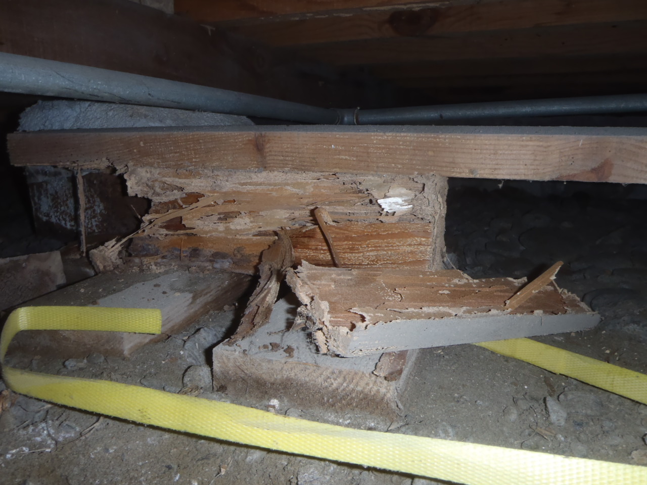 根太掛けもボロボロでした。これでは、床板が沈むのも時間の問題です。大工工事が必要となります。