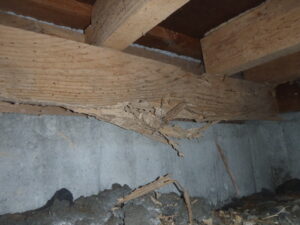 築古の住宅にあるケースです。木材を地面に直接つけて、一部の床組みを組んであります。シロアリの巣は地中にあるので、まさに巣の上に餌を置いて呼び寄せている状態です。