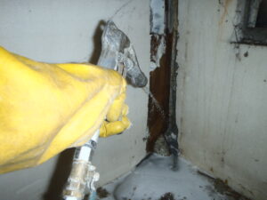 拡大写真です。白いものが断熱材で、茶色いものがシロアリが侵入した痕跡です。剥離して初めて発見できました。