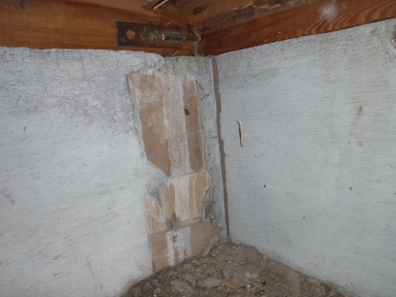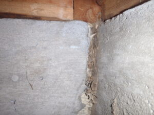 この木曽町のお宅は板の右側に蟻道が見られます。このような木枠はできる限り撤去しておかなければなりません。
