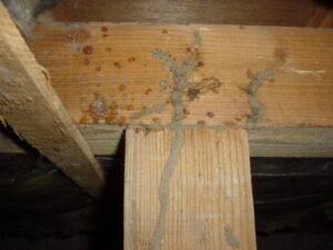 一本の蟻道から活動範囲をより広げた状態です。木材の内部も道を巡らせているため、シロアリが内部に残らないよう細かく注入していきます。